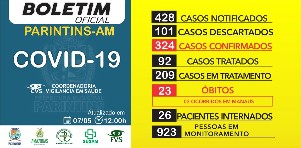 De acordo com o boletim divulgado, agora há pouco, pela Secretaria de Saúde e pela Vigilância em Saúde, o total de pessoas diagnosticadas com a Covid-19 chegou a 324 e o número de óbitos a 23. Em 24h foram constatadas 2 mortes.
