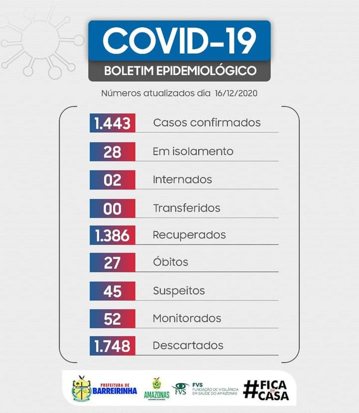 O Boletim Epidemiológico publicado nesta quarta-feira, 16 de dezembro, pela Secretaria Municipal de Saúde (Semsa) e pela Coordenadoria da Fundação de Vigilância em Saúde de Barreirinha (FVS), informa que uma pessoa testou positivo para Covid-19 no município nas últimas 24h.