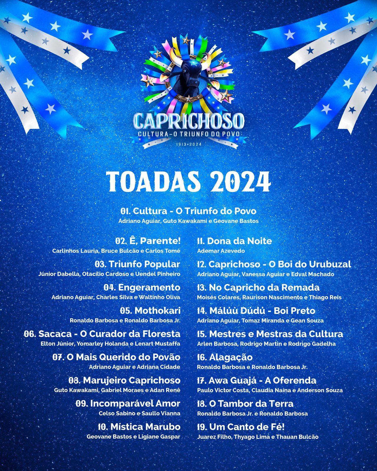 O Boi Caprichoso definiu as toadas que irão compor o álbum 2024 “Cultura, O Triunfo do Povo”. Após o processo de seleção, o bumbá selecionou 19 poesias musicais que irão reger a apresentação campeã no Festival de Parintins deste ano. O repertório azul e branco conta composições inspiradoras de tradicionais poetas da Ilha Tupinambarana e jovens talentos da musicalidade atual.