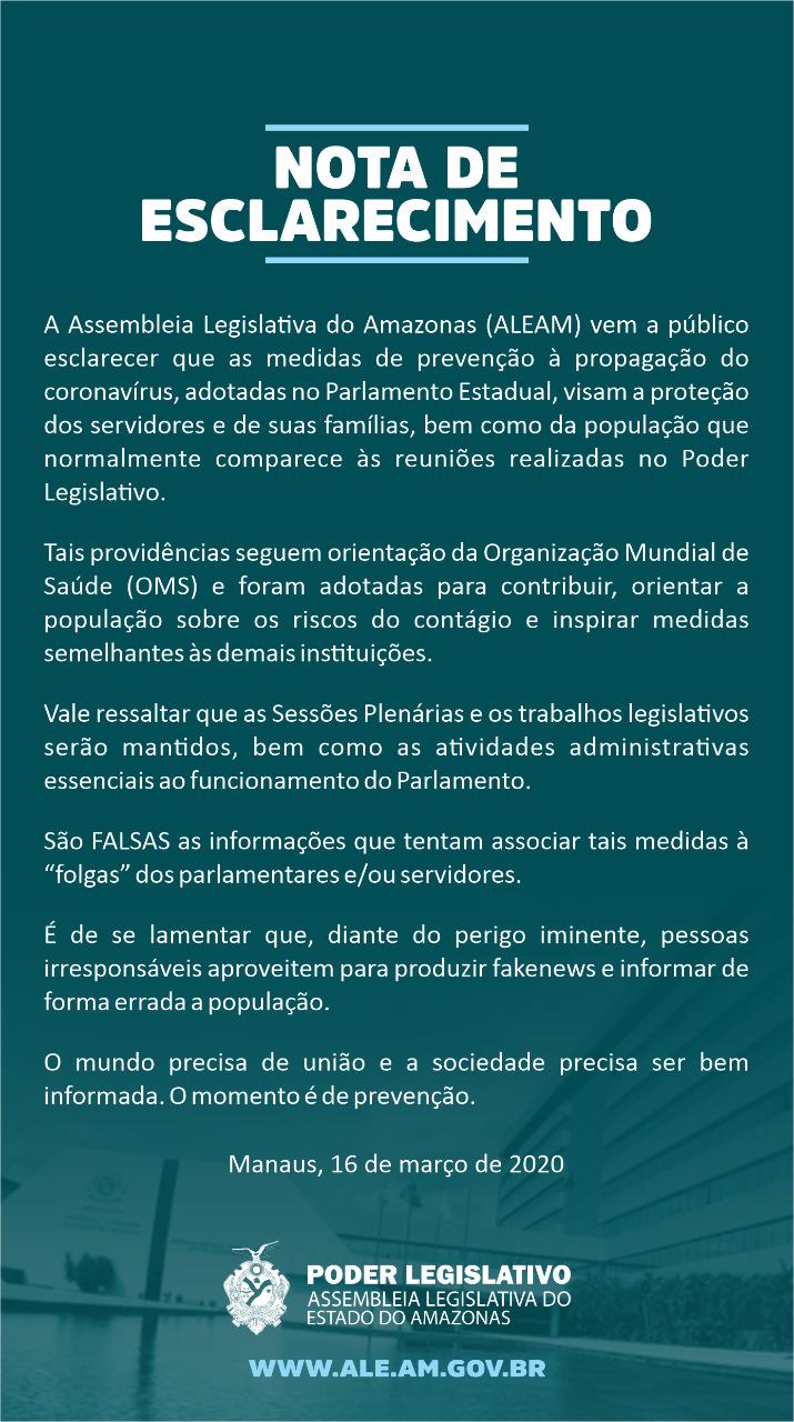 A Assembleia Legislativa do Amazonas (ALEAM) vem a público esclarecer que as medidas de prevenção à propagação do coronavírus, adotadas no Parlamento Estadual, visam a proteção dos servidores e de suas famílias, bem como da população que normalmente comparece às reuniões realizadas no Poder Legislativo.