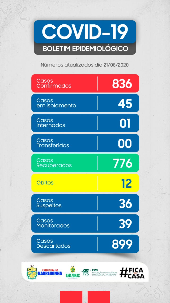 O boletim oficial publicado nesta sexta-feira, 21 de agosto, pela Prefeitura de Barreirinha, aponta 8 novos casos da Covid-19 no município e 5 novas pessoas recuperadas da doença, sem óbitos nas últimas 24h.