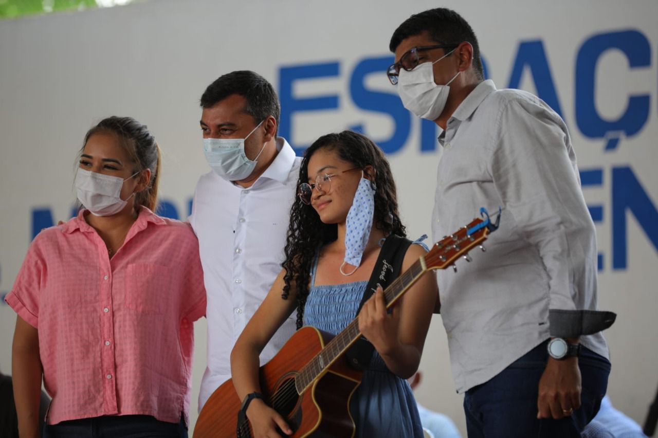 O governador Wilson Lima participou, nesta quinta-feira (03/02), da entrega dos instrumentos do projeto da Associação Mãos Solidárias, que foi a entidade contemplada no edital. Com o recurso do prêmio, a instituição adquiriu 100 flautas, 30 violões e 8 teclados, além de acessórios musicais utilizados nas aulas.