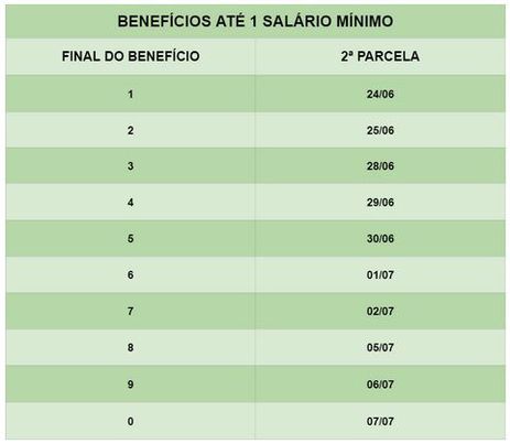 O pagamento é feito em duas parcelas. A primeira, correspondente a 50% do benefício devido no mês de maio de 2021, foi paga com os benefícios dessa competência – de 25 de maio a 8 de junho. A segunda parcela está sendo paga junto com os benefícios da competência do mês de junho de 2021 – de 24 de junho a 7 de julho. Normalmente, o pagamento ocorre nas competências de agosto e novembro.