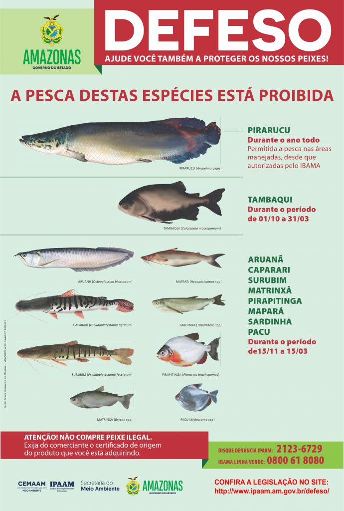 O Instituto de Proteção Ambiental do Amazonas (Ipaam), com o objetivo de reforçar a proteção das espécies aquáticas para os pescadores e feirantes, informa que o Período de Defeso 2021 iniciará na segunda-feira (15/11) e seguirá até o dia 15 de março de 2022. Neste período, estarão proibidas as pescas das espécies aruanã, caparari, mapará, matrinxã, pacu, pirapitinga, sardinha e surubim.