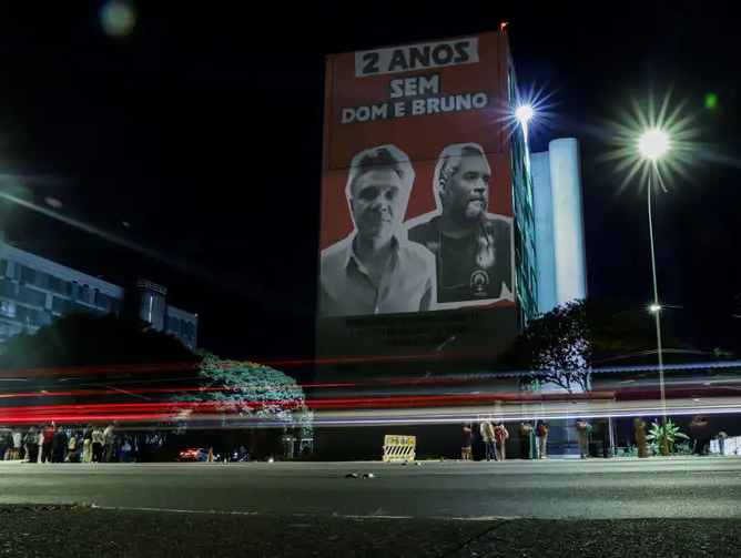 Em memória aos dois anos da morte do indigenista Bruno Pereira e do jornalista Dom Phillips, imagens foram projetadas na parede do ministério dos Direitos Humanos em 2024 Foto: Joédson Alves/Agência Brasil