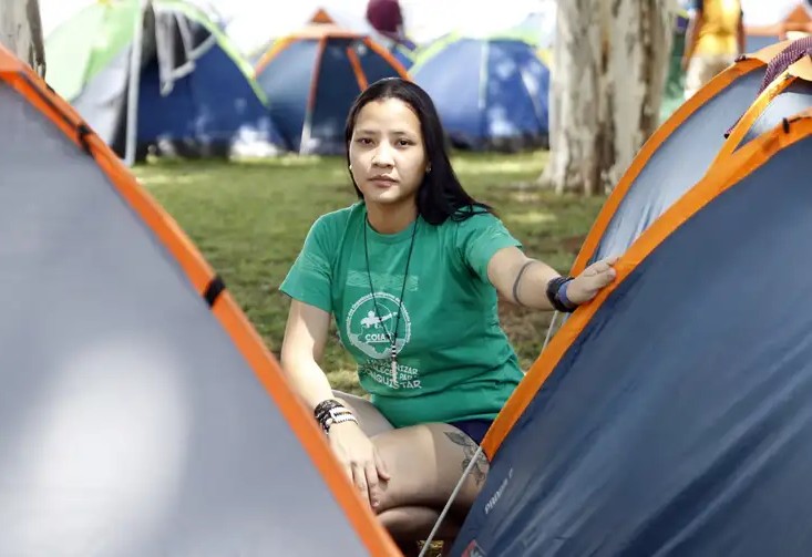 Marciely Tupari, coordenadora secretária da COIAB, em frente a barracas no Acampamento Terra Livre (ATL), no espaço Funarte. Bruno Peres/Agência Brasil