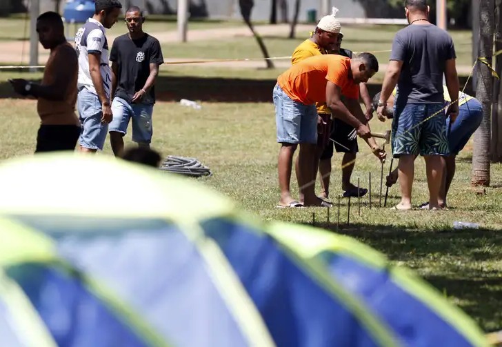 Indígenas montam barraca no Acampamento Terra Livre (ATL), no espaço Funarte. Bruno Peres/Agência Brasil