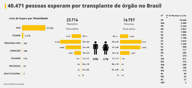 Uma lista extensa e dinâmica. Assim é o cadastro das pessoas que esperam por um órgão no Brasil. A chamada fila do transplante muda diariamente, à medida que órgãos são destinados a pacientes que dependem da doação para sobreviver. De acordo com a atualização mais recente do Ministério da Saúde — de 18 de setembro — 40.471 pessoas esperam para receber um órgão.