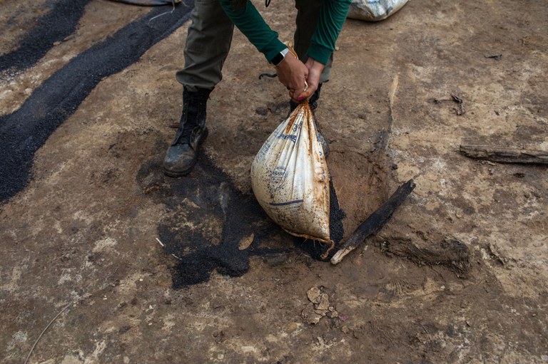 Agente do Ibama inutiliza sacos de cassiterita durante fiscalização contra o garimpo ilegal - Foto: Bruno Mancinelle | Casa de Governo