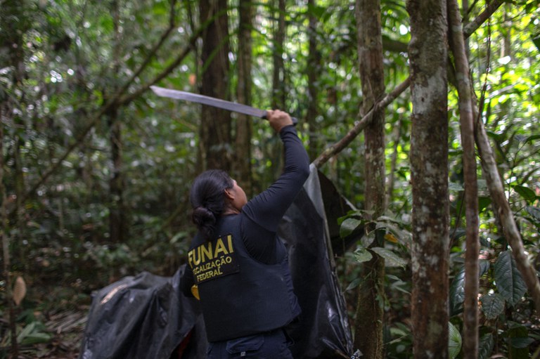 A Agente de Proteção Etnoambiental Katiane leite destrói um acampamento usado por garimpeiros na Terra Indígena Yanomami - Foto: Bruno Mancinelle | Casa de Governo