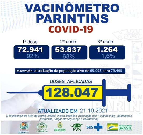 Conforme a Vigilância em Saúde, atualizando o Vacinômetro, foram aplicadas 128.047 doses de vacina contra a Covid-19, sendo 72.941 de 1ª dose (92%), 53.837 de 2ª dose (68%) e 1.264 de 3ª dose ou dose de reforço (1,6%) até o dia 21 de outubro.