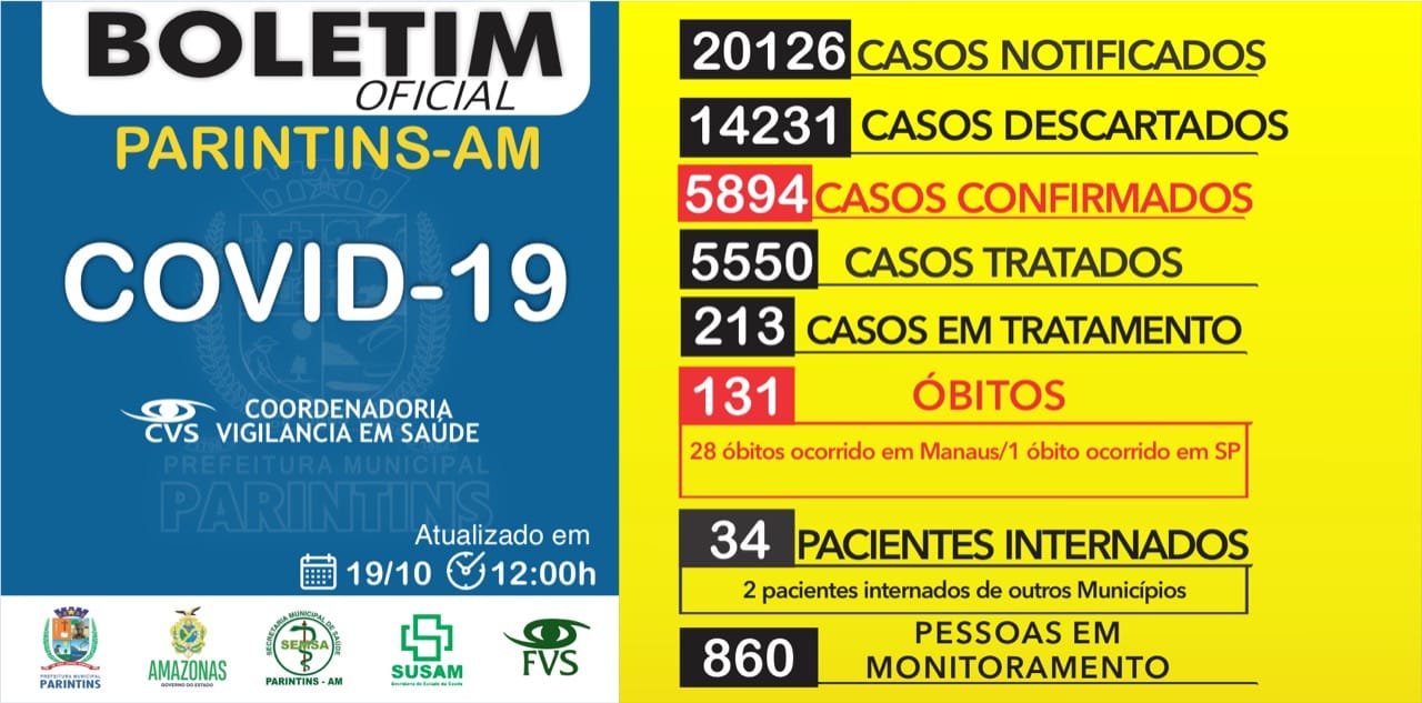 O município de Parintins registrou 15 novos casos de contaminação por Covid-19 nesta segunda-feira (19/10), elevando para 5.894 casos ativos do vírus. Este é o segundo dia em queda de casos.