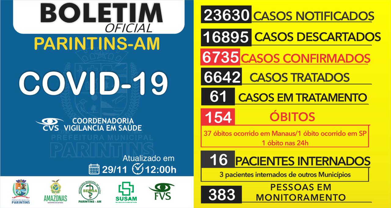 O número de casos de Covid-19 em Parintins chega a 6.735 neste domingo (29/11). De acordo com a Vigilância em Saúde, foram registrados 6 novos casos da doença.