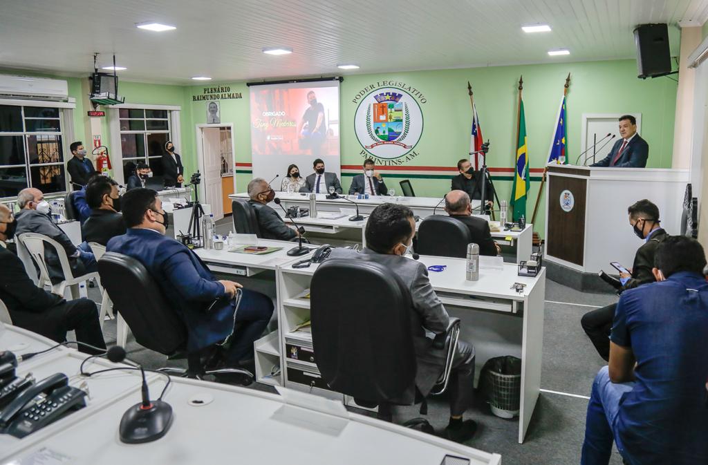 O prefeito Bi Garcia (DEM), demais vereadores e secretários municipais participaram da sessão presidida pelo presidente da casa, vereador Mateus Assayag (PL).